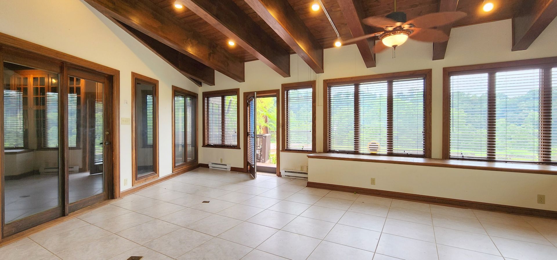 • Four bedrooms, two full bathrooms, one half bath, kitchen, dining area, den, Florida Room, sunroom, canning- laundry room, music/media/reading room, gas fired heat pumps, air conditioning, electric baseboard heat, wood heat, exposed aggregate concrete driveway with spacious parking area